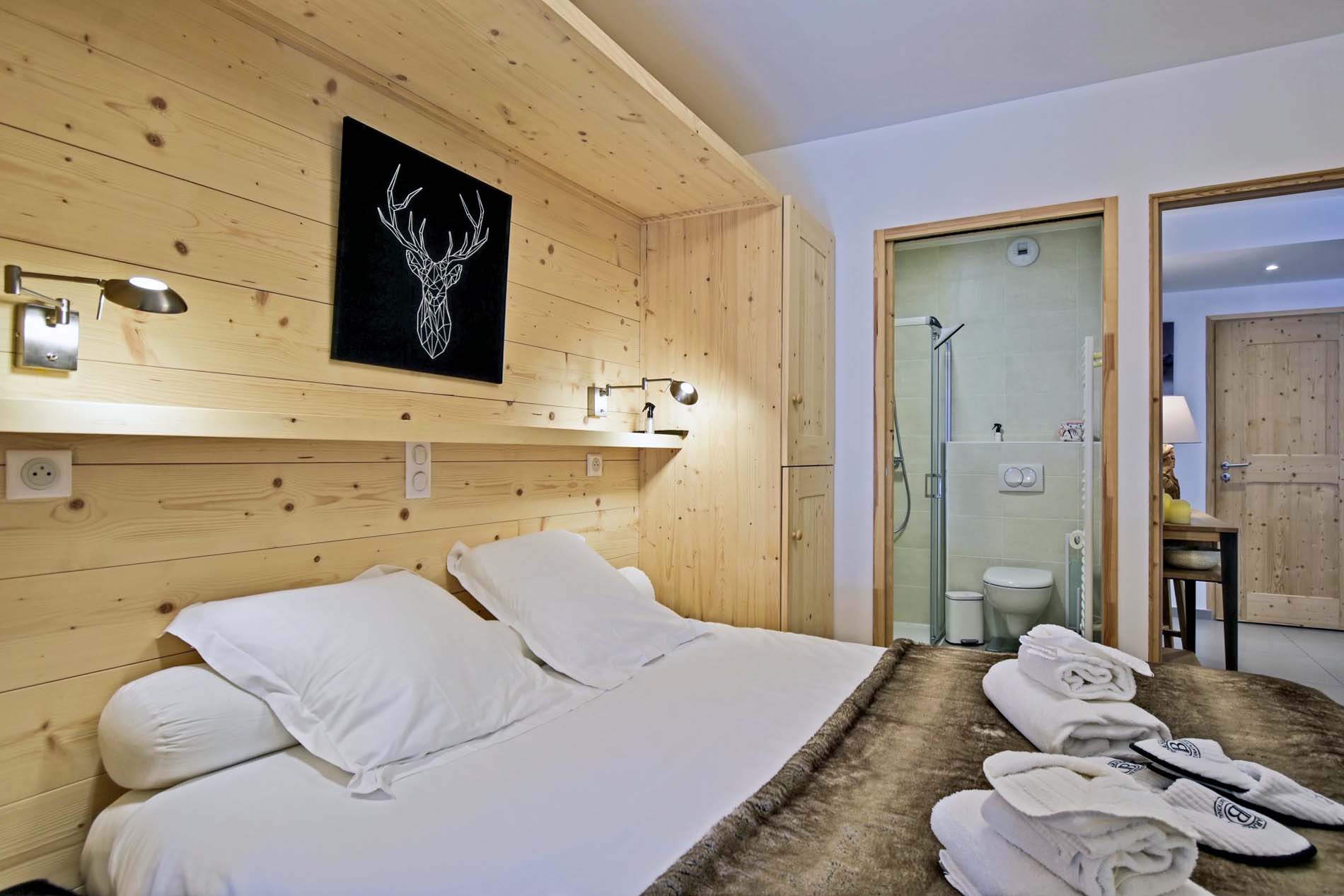 Bedroom 1: Double bed with access to the terrace and en-suite bathroom with shower, wash basin and WC.
