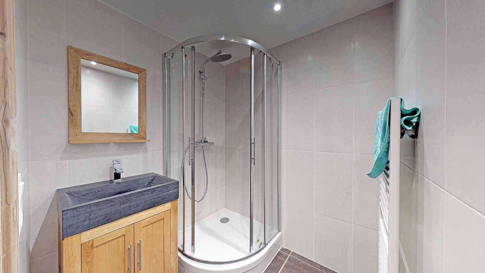 - Bathroom with shower and wash basin