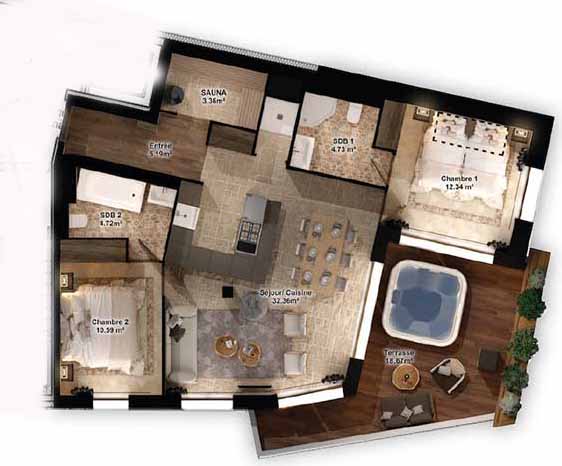 - Open plan kitchen living and dining area with terrace with jacuzzi