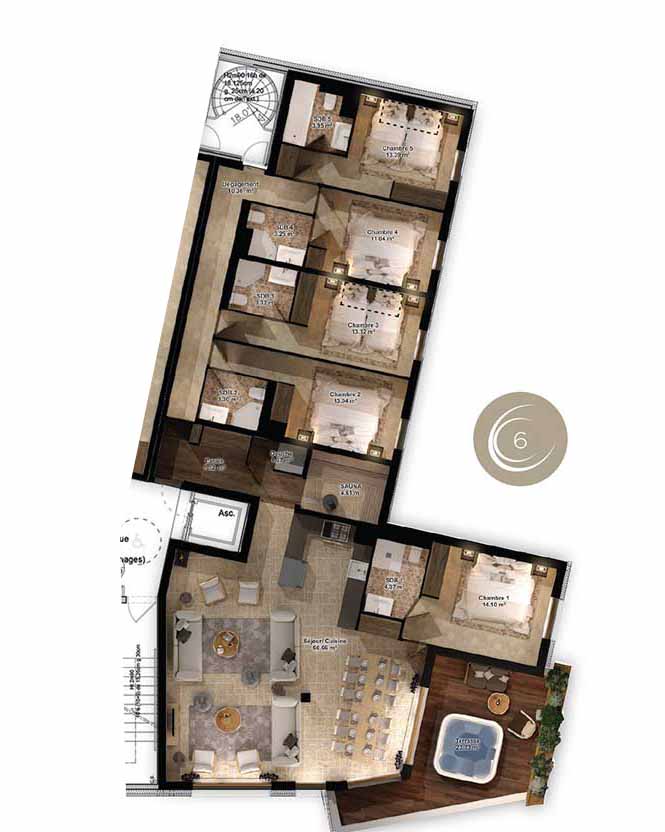 - Bedroom 5: Twin beds with extra top bunk (sleeps 3) with ensuite bath, wc and washbasin