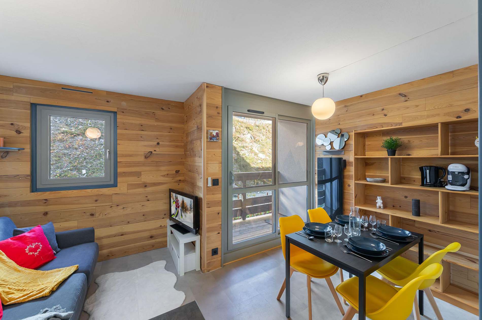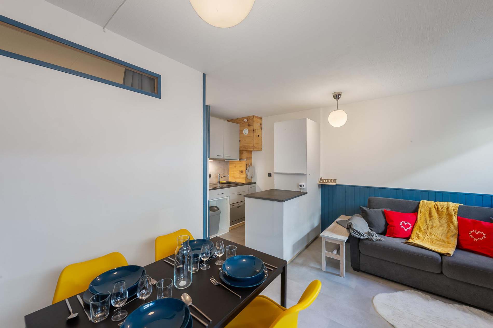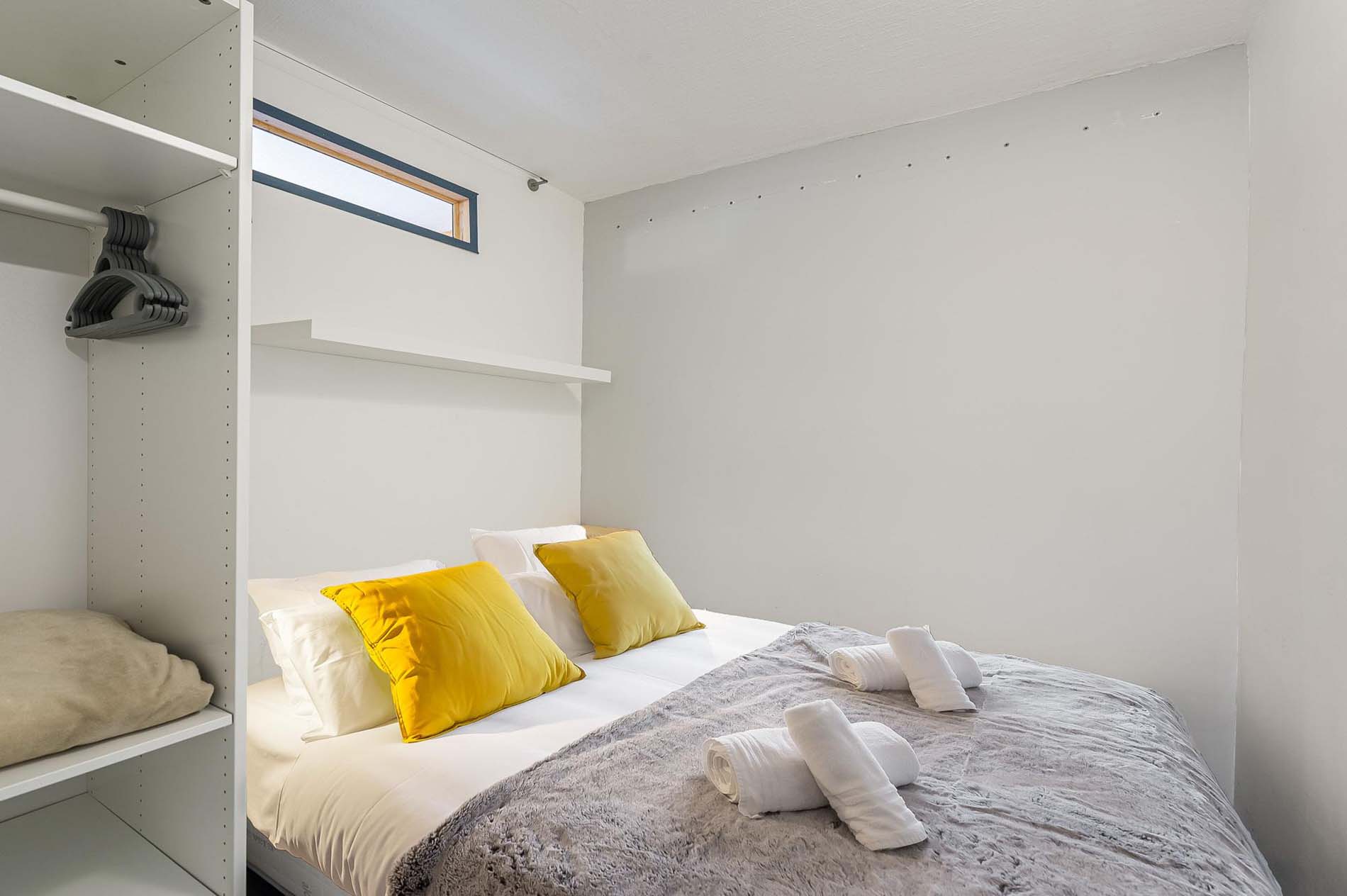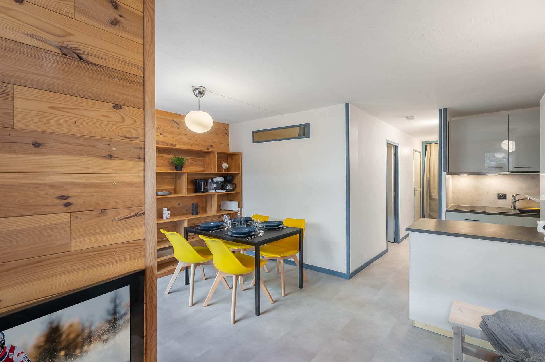 The apartment has a clever layout with two separate sleeping areas to accommodate two adults and two children. The decor, subtly combining yellow for a dynamic touch and wood for a warm ambience, creates a welcoming and sparkling atmosphere.