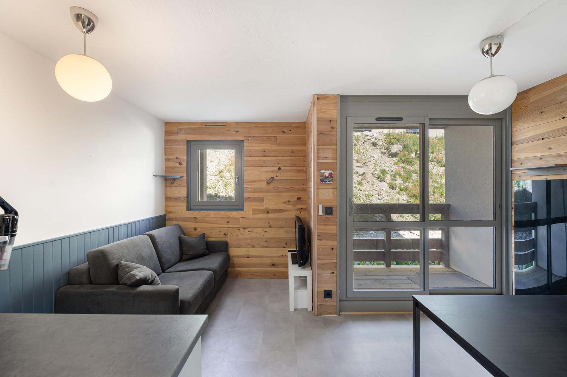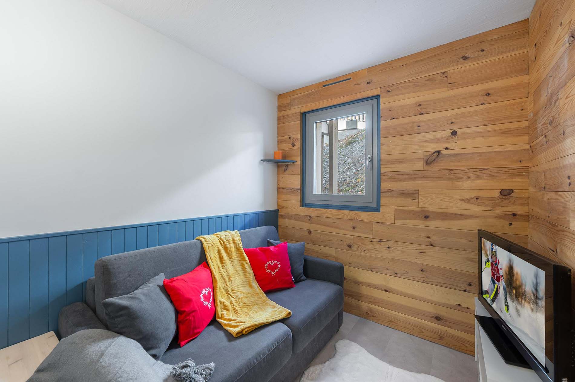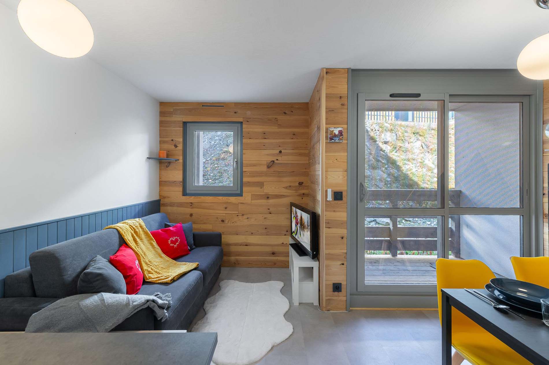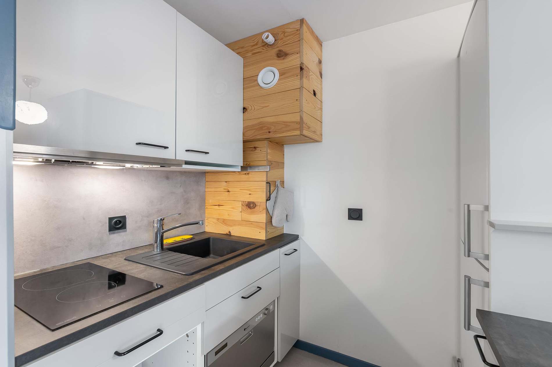 The apartment has a clever layout with two separate sleeping areas to accommodate two adults and two children. The decor, subtly combining yellow for a dynamic touch and wood for a warm ambience, creates a welcoming and sparkling atmosphere.