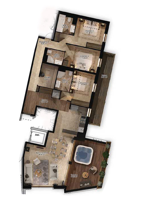 - Open plan kitchen living and dining area with terrace with jacuzzi