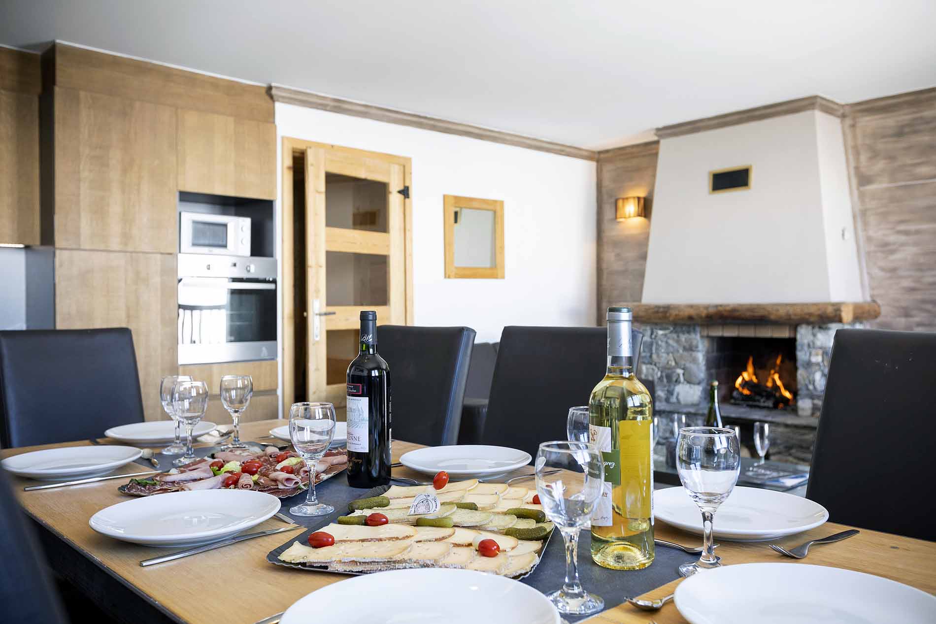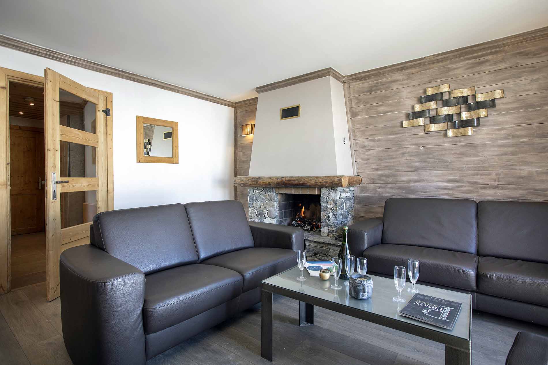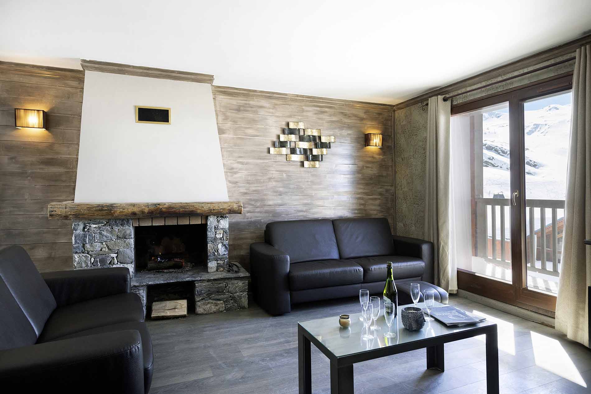 - Living room with balcony and fireplace