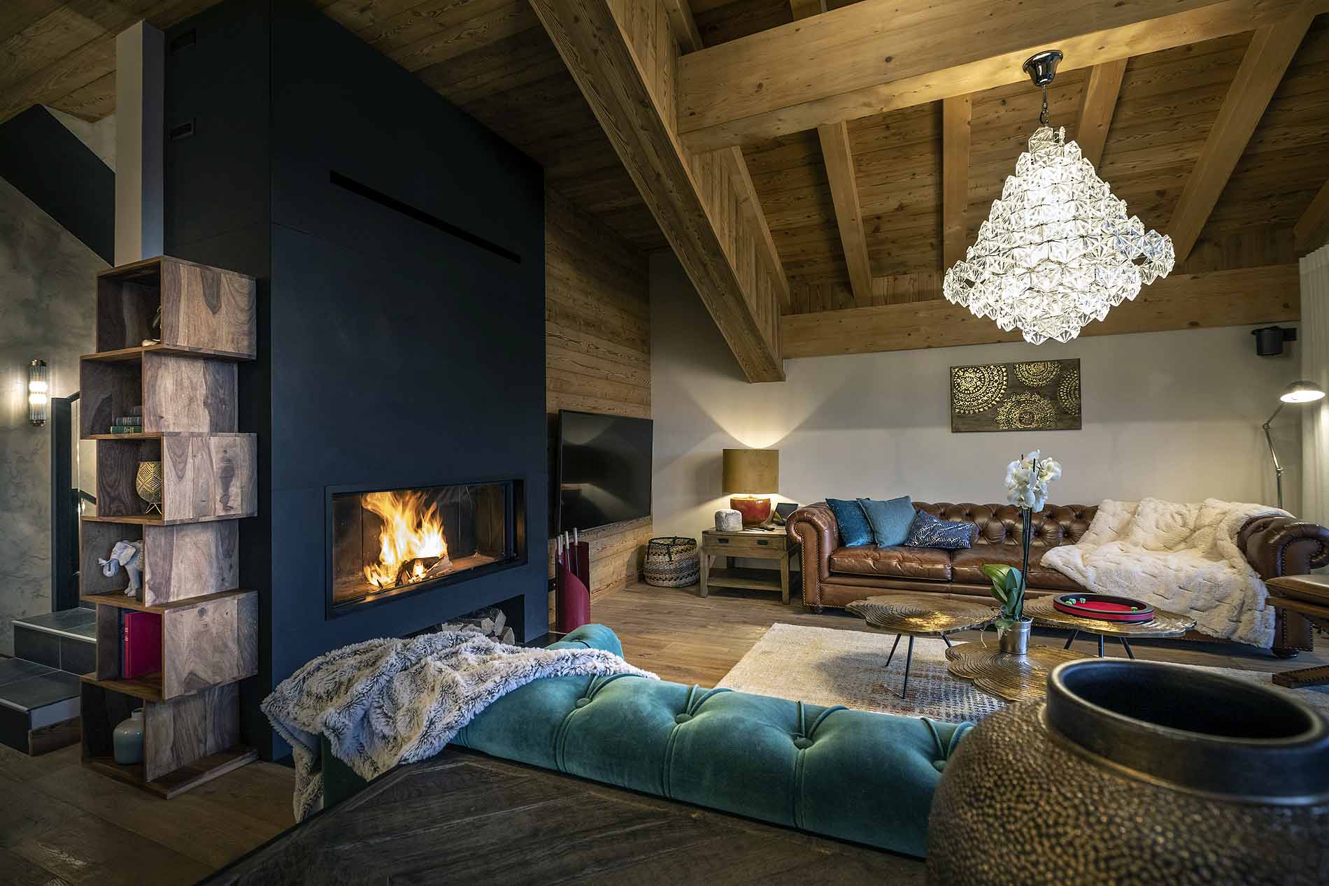 - Living area with fireplace and south facing terrace.